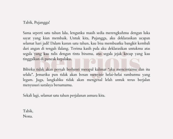 - Pembeli dapat menyimpan atau memberikan kepada orang lain tulisan yang telah dibeli, namun DILARANG KERAS menjual kembali tulisan yang telah ditulis oleh Beurjois, baik yang sudah dibeli ataupun portofolio terunggah. Apabila didapati hasil karya yang dijual kembali, maka akan dikenakan denda sebesar Rp 950.000,-