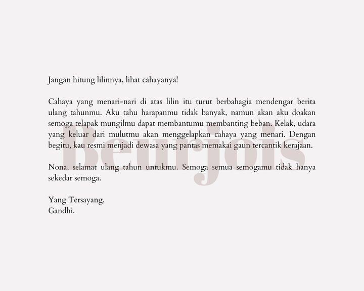 - Pembeli dapat menyimpan atau memberikan kepada orang lain tulisan yang telah dibeli, namun DILARANG KERAS menjual kembali tulisan yang telah ditulis oleh Beurjois, baik yang sudah dibeli ataupun portofolio terunggah. Apabila didapati hasil karya yang dijual kembali, maka akan dikenakan denda sebesar Rp 950.000,-